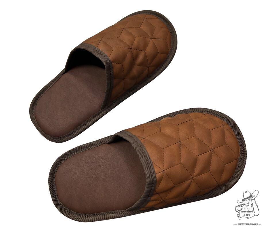 Ein Paar braune Kunstleder-Pantoffeln mit 3D-Waffelmuster.