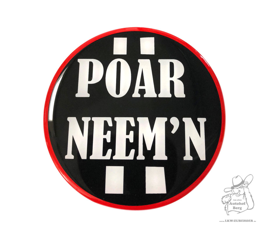 Glänzender, runder 3D-Nabenaufkleber in Schwarz mit rotem Rand und weißem Text 'POAR NEEM'N'.