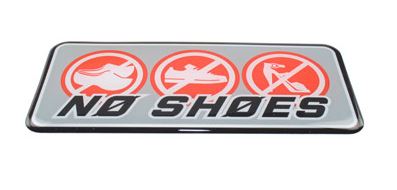 3D Aufkleber "No Shoes" mit durchgestrichenen Schuhsymbolen auf grauem Hintergrund.