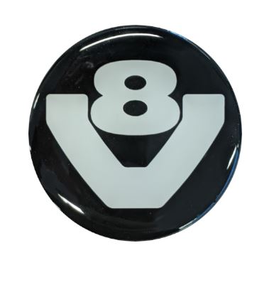 Schwarzer, runder Epoxi Nabensticker mit weißem V8-Logo.