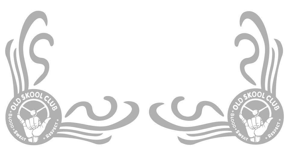 Paar graue Glas-Dekoraufkleber mit 'Old Skool Club' Emblem, Hand am Lenkrad, 'Blood Sweat Respect' und geschwungenen Linien.