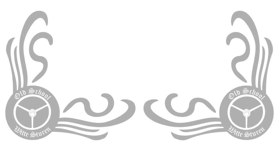 Ein Paar graue Glas Dekor Aufkleber mit Old School Lenkrad-Motiv und Schriftzug "Old School Witte Sturen".