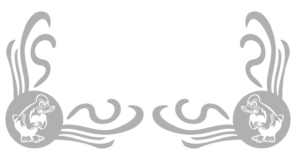 Paar graue Glas-Dekor-Aufkleber mit Comic-Enten-Motiv und geschwungenen Verzierungen für Seitenscheiben.