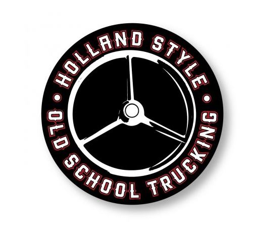 Runder Aufkleber, schwarz, mit weißem Oldschool-Lenkrad. Text: Holland Style (weiß), Old School Trucking (rot).