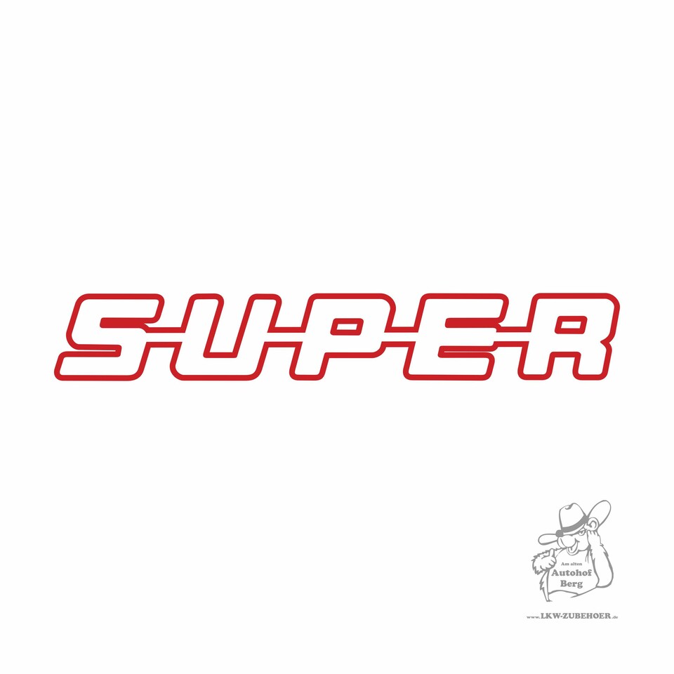 Grauer Kontur-Aufkleber mit dem Schriftzug SUPER auf weißem Hintergrund.