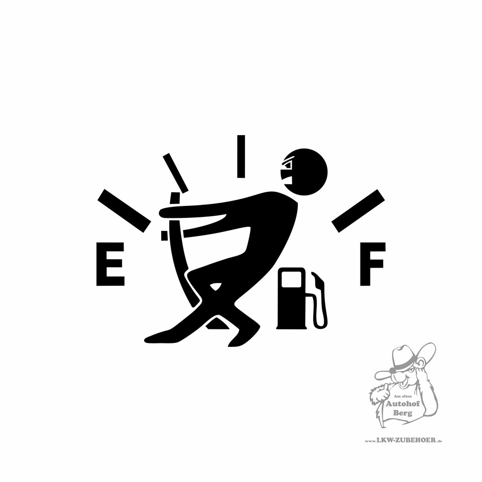 Schwarzer Aufkleber mit einem Tankmännle, das an einer Zapfsäule zieht, vor einer Tankanzeige mit E und F.