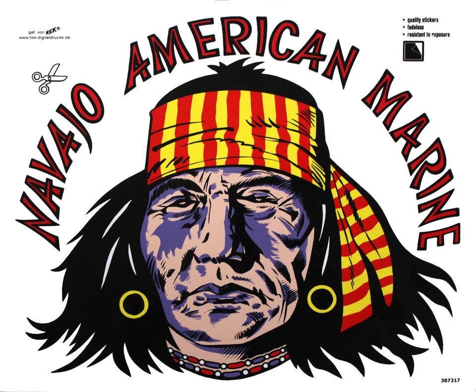 Sticker mit dem Kopf eines Native American, rot-gelbem Stirnband und dem Schriftzug Navajo American Marine auf transparentem Hintergrund.
