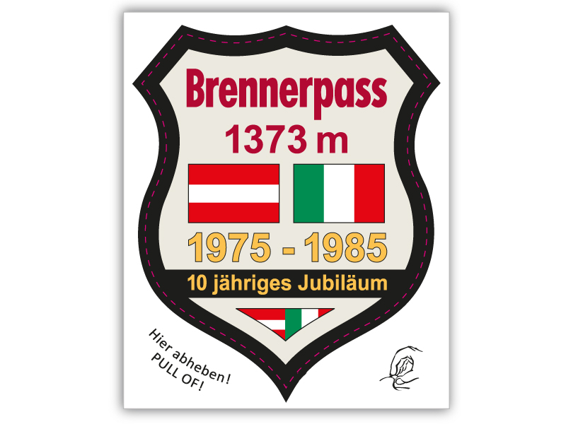 Schildförmiger Aufkleber "Brenner" mit "Brennerpass 1373 m", österreichischer und italienischer Flagge sowie "1975-1985".