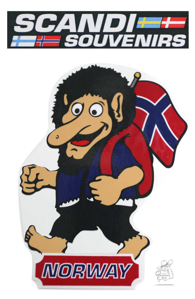 Scandi Troll Aufkleber mit schwarzem Haar, großer Nase und norwegischer Flagge. Der Troll trägt einen roten Rucksack. Schriftzug "NORWAY".