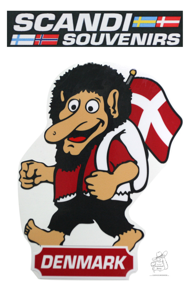 Scandi Troll Aufkleber in Rot, Schwarz und Weiß, mit dänischer Flagge und "DENMARK" Schriftzug.
