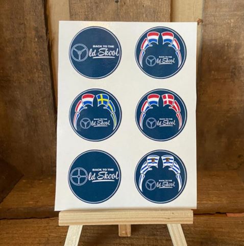 Runde, blaue Old Skool Aufkleber mit Lenkrad-Symbolen und skandinavischen Flaggen auf einem Ständer.