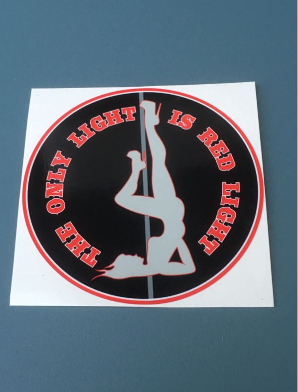 Runder Aufkleber mit schwarzem Hintergrund, rotem Rand und rotem Text "THE ONLY LIGHT IS RED LIGHT". Zeigt eine graue Poledance-Silhouette.