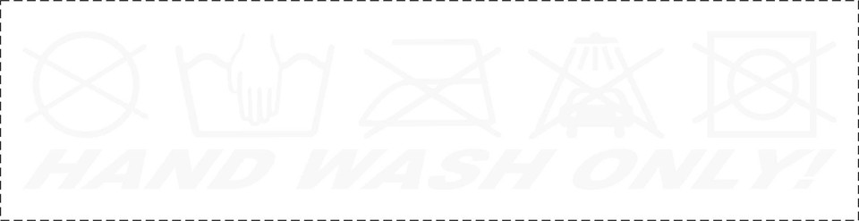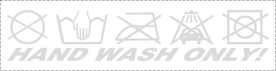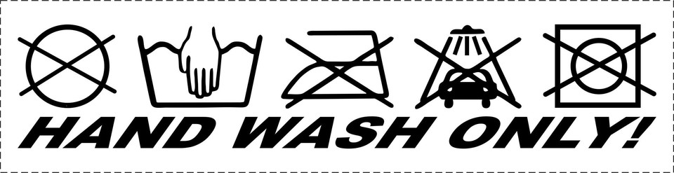 Weißer Aufkleber mit dem Text 'HAND WASH ONLY!' und passenden Waschsymbolen.