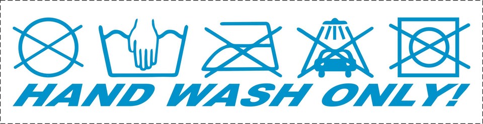 Blauer Aufkleber auf weißem Hintergrund mit "HAND WASH ONLY!" Text und Symbolen für Handwäsche, kein Bügeln und keine Autowäsche.