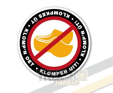 TJ Aufkleber: Rundes Verbotsschild mit gelben Holzschuhen und dem Text "Klompen uit!".