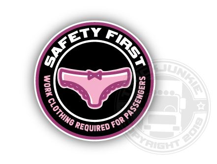 Runder Aufkleber "Safety First" mit pinker Unterhose und dem Text "Work Clothing Required for Passengers".