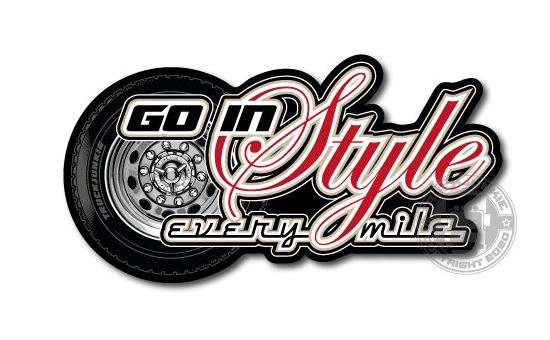 Schwarzer Aufkleber mit LKW-Reifen und Felge. Schriftzug "GO IN Style every mile" in Weiß und Rot, "TRUCKJUNKIE" auf dem Reifen.