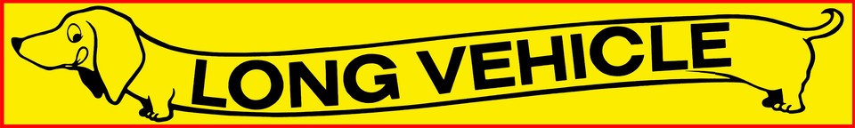 Gelber Aufkleber mit schwarzem Dackel-Design und dem Text "LONG VEHICLE".