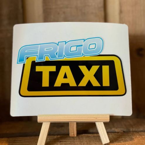 Weißer Scandi Aufkleber mit blauem 'FRIGO' und gelb-schwarzem 'TAXI' Schriftzug, auf Holzständer.
