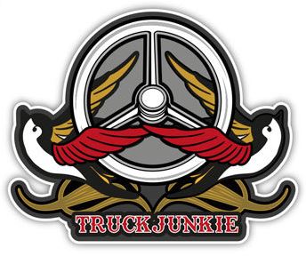 TJ Aufkleber: Silbernes Lenkrad mit zwei schwarzen Schwalben, roten Flügeln und dem Schriftzug 'TRUCK JUNKIE'.