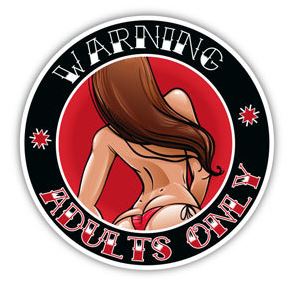 Runder TJ Aufkleber mit schwarzem Rand, rotem Hintergrund, der Aufschrift 'WARNING ADULTS ONLY' und einer Frau von hinten.