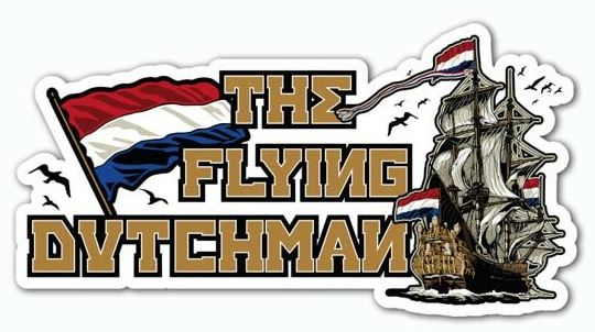 TJ Aufkleber Flying Dutchman: Buntes Design mit goldener Schrift, niederländischer Flagge, Segelschiff und Vögeln.