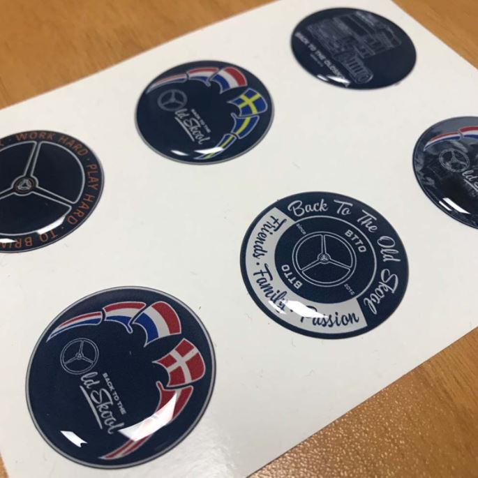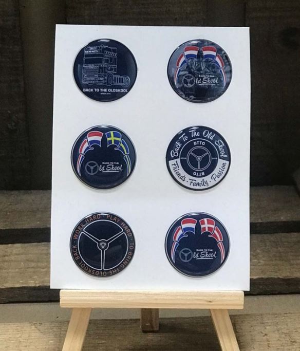 Ein Scandi 3D Stickerset mit runden, dunkelblauen Motiven wie LKW und Flaggen, teils mit 'Back to the Old Skool'.
