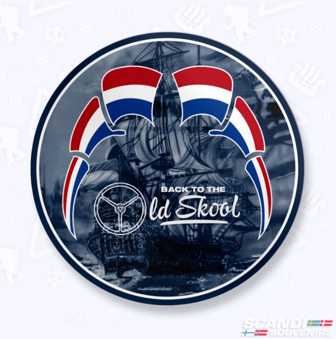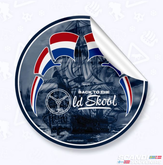 Runder Scandi Aufkleber mit dunklem Segelschiff, niederländischen Flaggen und "Back to the Old Skool" Schriftzug.