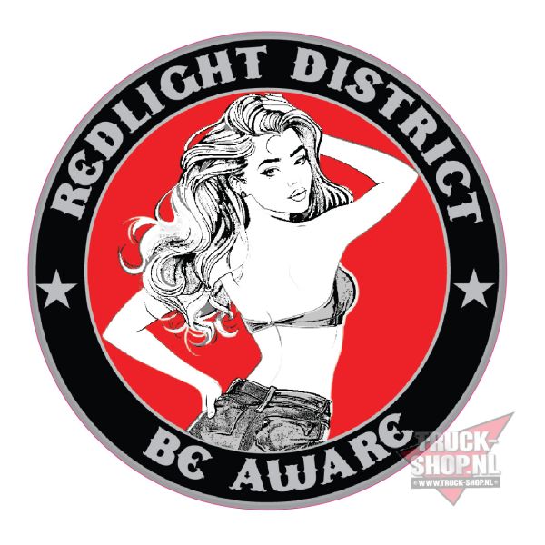 Runder DTS Aufkleber mit einer Frau in BH und Jeans. Roter Hintergrund, schwarzer Rand mit "REDLIGHT DISTRICT" und "BE AWARE".