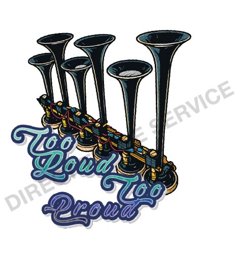 Aufkleber mit mehreren schwarzen Lufthörnern und dem Schriftzug "Too Loud Too Proud" in Türkis und Lila.