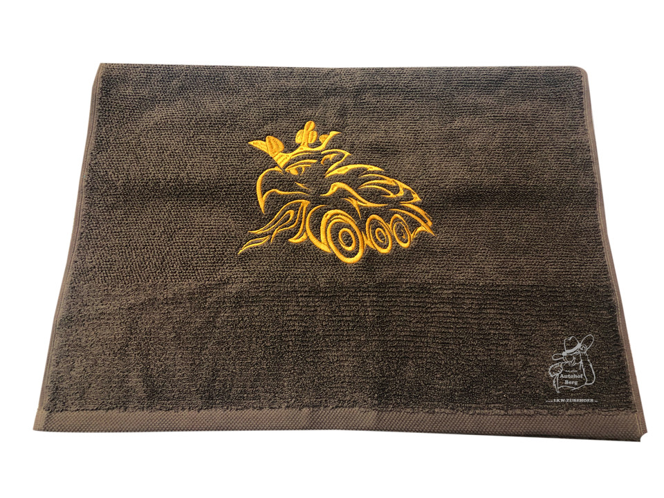 Braunes Handtuch mit goldener, stilisierter LKW-Stickerei.