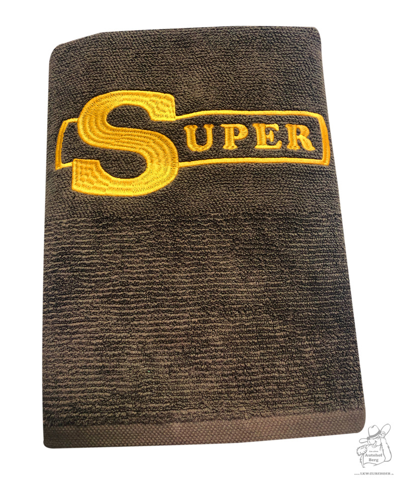Braunes Duschtuch mit gelbem SUPER-Stick.