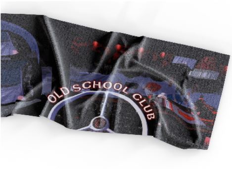 Dunkles Mikrofaser Strandtuch mit "Old School Club" Lenkrad-Design.