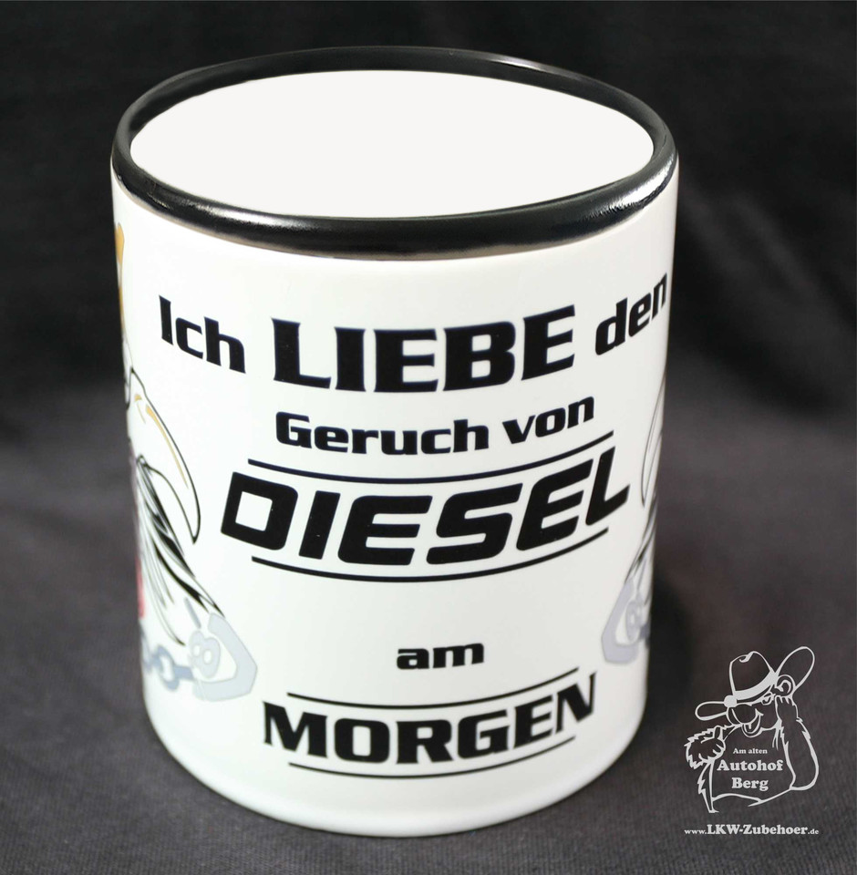 Weiße Tasse mit schwarzem Rand und dem Spruch "Ich LIEBE den Geruch von DIESEL am MORGEN".