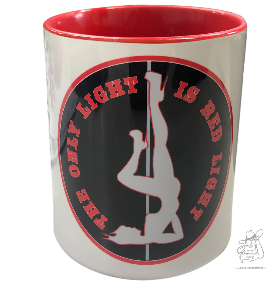 Weiße Tasse mit rotem Rand und Innenseite. Aufdruck: Schwarzer Kreis mit roter Schrift 'THE ONLY LIGHT IS RED LIGHT' und weißer Silhouette einer Pole-Tänzerin.