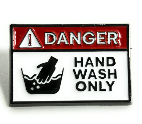 Rechteckiger DTS Pin in Rot, Weiß, Schwarz. Zeigt 'DANGER' und Handwasch-Symbol mit 'HAND WASH ONLY' Text.