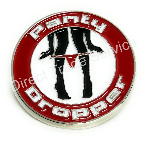 Runder DTS PIN mit silbernem Rand, rotem Ring und weißem Zentrum. Zeigt schwarze Beine und eine rote Panty. Text: PANTY DROPPER.