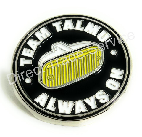 Runder DTS PIN Team Talmu mit schwarzem Hintergrund, gelber LKW-Leuchte und der Aufschrift "TEAM TALMU ON ALWAYS".