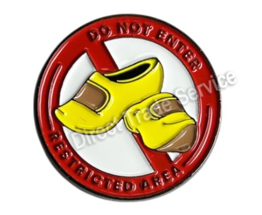 Runder DTS Pin mit rotem Verbotszeichen und gelben Holzschuhen. Aufschrift: DO NOT ENTER RESTRICTED AREA.