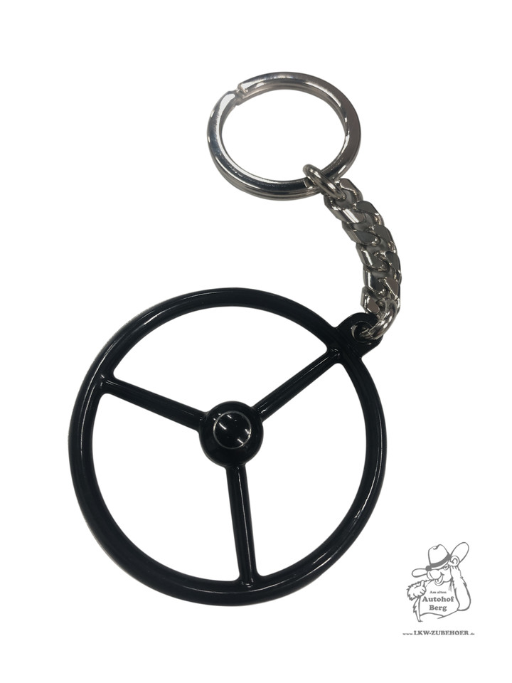 Schwarzer Lenkrad-Schlüsselanhänger mit silberner Kette und Ring.