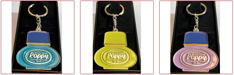 Mehrere Schlüsselanhänger in Form von Poppy Grace Mate Lufterfrischern in Blau, Gelb und Lila.