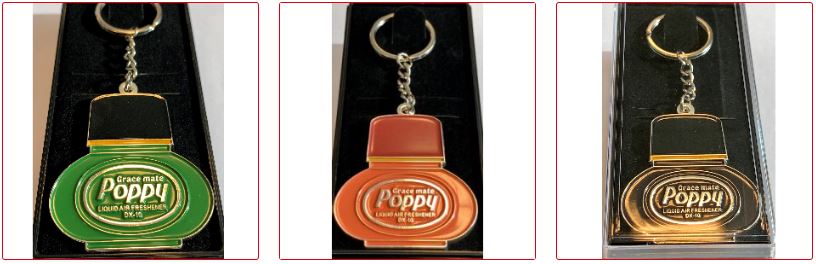Mehrere Poppy Grace Mate Schlüsselanhänger aus Metall in Rotbraun und Gelb, geformt wie Lufterfrischerflaschen.