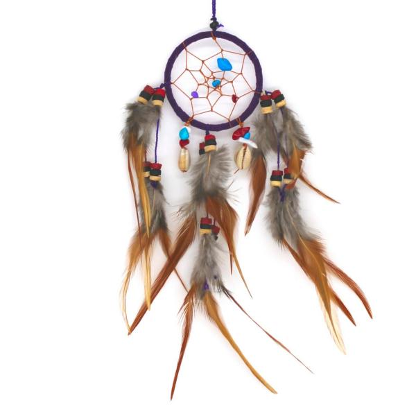 Runder Traumfänger mit lila Reifen, braunem Netz, bunten Perlen, Muscheln und mehreren Federn in Braun- und Grautönen.