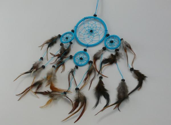 Blauer Traumfänger mit mehreren Ringen, verziert mit braunen Federn und dunklen Perlen.