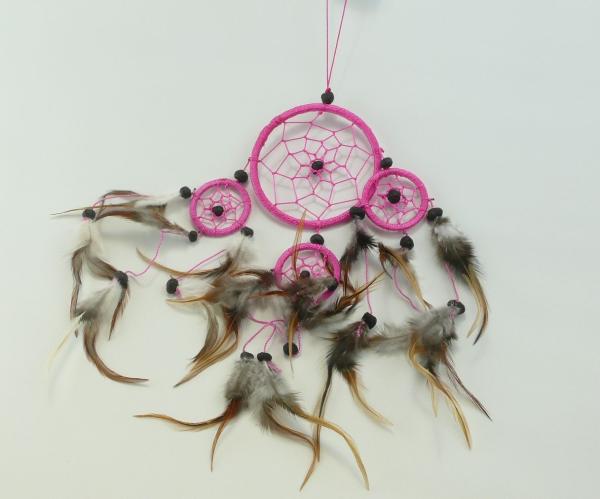 Pinker Traumfänger mit einem großen und mehreren kleinen Ringen, verziert mit dunklen Perlen und braun-grauen Federn.
