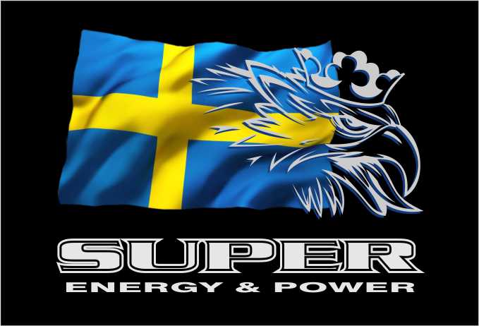 Schwedische Flagge in Blau-Gelb mit weißem Scania Greif-Logo und dem Text "SUPER ENERGY & POWER".