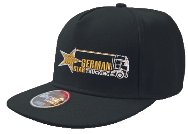 Schwarze Snapback Cap mit gesticktem Motiv: goldener Stern, LKW-Umriss und "GERMAN STAR TRUCKING" Schriftzug.