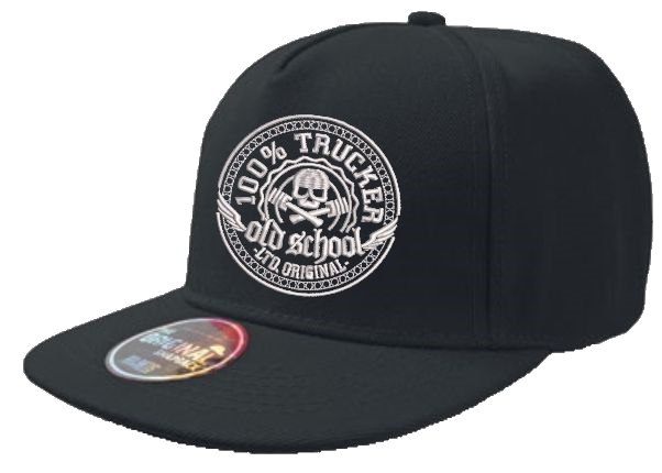 Schwarze Snapback-Cap mit weißem, gesticktem Motiv: Totenkopf, Hanteln und "100% TRUCKER old school" Schriftzug.
