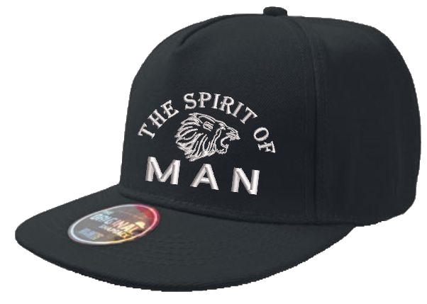 Schwarze Snapback Cap mit weiß gesticktem Motiv "THE SPIRIT OF MAN" und Löwenkopf.