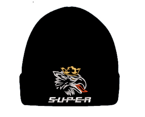 Schwarze Mütze mit gesticktem Scania Greif-Logo und dem Schriftzug 'S-U-P-E-R'.